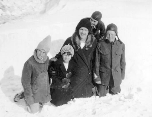 Achsah is shown here with children in the snow of Pocatello, Idaho.