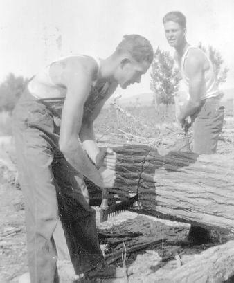 Emerson (front) is sawing a log with brother Calvin. No wonder they had muscles.