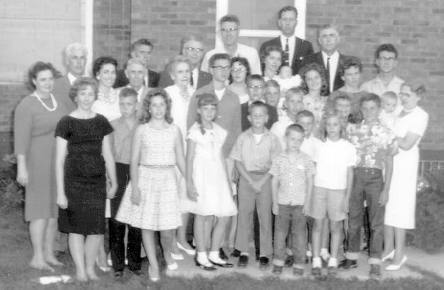 L-R :Front: Aunt June, Aunt Rachel, Clarence Jr., Suzette Teerlink, Marilyn, Martin, Kent, Mark, Carol, Earl, Baby Richard with Aunt Frances 2nd row L-R: Uncle Arthur, Velma, Calvin Sr., Achsah, Gail, Susan, Val, Robert, David T., Ruth, Carol (Wife of George), and Douglas. 3rd row L-R: Uncle Ferryle, Uncle Calvin, Uncle Adrian, Aunt Grace with baby, back is Uncle Clarence and Uncle Ferryle. (not sure who is standing at the back of Kent, by