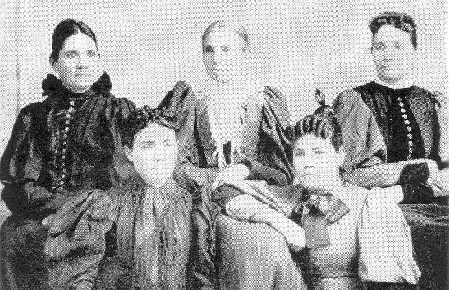 L-R: "Rettie", Henrietta (mother), Sarah (Sadie) Front: Julia and Artimisha (Black) Rettie, Sarah, and Julia married David Fisk Stout Rettie is Achsah's mother. This royal group of women are wearing silk dresses that were made at St. George. Grandma McOmber (Achsah) remembers the Mulberry bushes and the silk worms that were at their Rockville home. They not only were on a Cotton Mission to grow cotton in St. George, but they knew the art of silk making. St. George was known for its fine dress shops. Henrietta Janes crossed the plains with a hand cart as a youth, accompanied by her widowed mother.