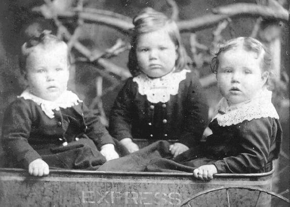 L-R: Wendell, Emerald, and baby Achsah in an express wagon as babies. Notice the willow furniture in the background. Allen and David Stout made such furniture.
