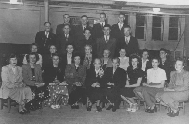 Front L-R: Virginia Schmidt, Velma Schmidt (Harris), Lurline Ray (Russell), Beth Stout (Warner), Sarah "Sadie" Cox Stout, Artemisia Cox Black, Merle Stout (Budd), Velma McOmber (Teerlink), Florence Heward (Oviatt) 2nd row, L-R: Ila Ray, Beulah Stout (Limb), Eunice Stout (Bryner), Achsah Stout (McOmber), Madonna Stout (Schmidt), Maxine Stout (Barney), Juanita Stout Ray, and Genevieve Stout Heward, 3rd Row: Dewey, Wayne, and Lyle Stout, Marray Richardson, and Emerald Stout Back: Abraham Lincoln Stout, F. Lyman Stout, Grant Heward, and Winston McOmber.