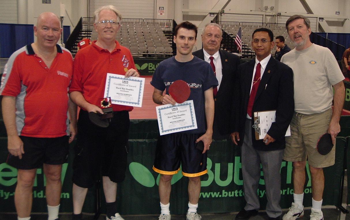 Hardbat Challenge. During the last few years, anyone who defeated Club President John Pratt in a best 3 of 5 series to 21 with a hardbat (short pips, no sponge, wooden blade) would win a box of three 3-star Premium Nitakku balls! No one ever did, but Noel Huermann never tried (he could easily have done so).